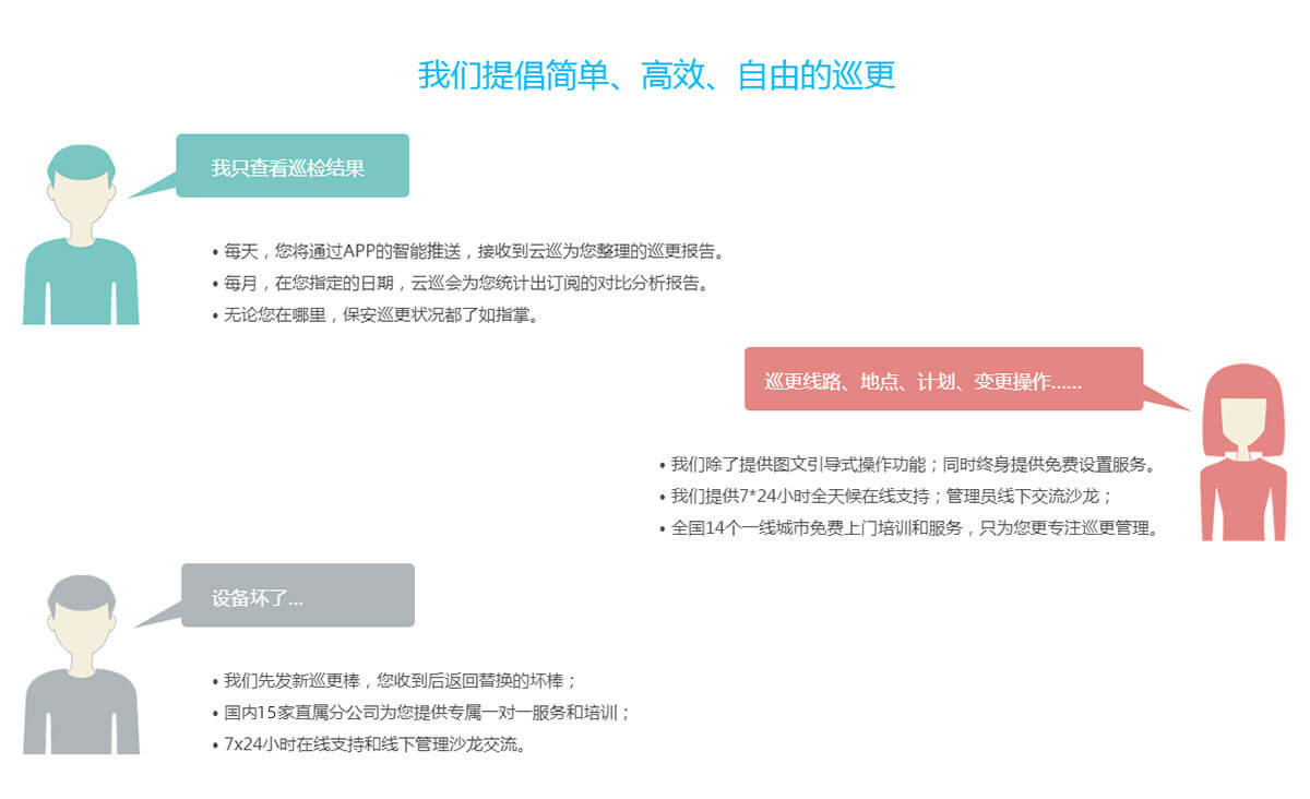 “云巡”巡更平台以公共服务的方式不仅可以在水务管理工作上广泛应用,它还为全国各大机关、企业、小区的巡更巡检工作提供远程智能实时监测、管理管控、自动预警等服务。具有全国实时联网、使用方便、高度智能化等特点,不仅仅解决了企业管理困难,还大大提高了企业安防、消防的查获率。